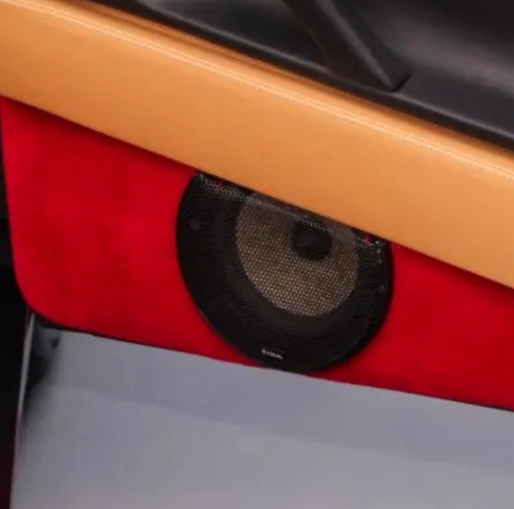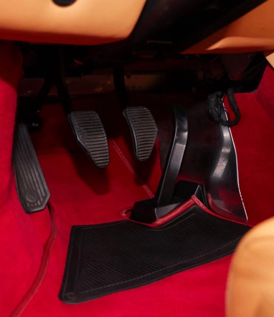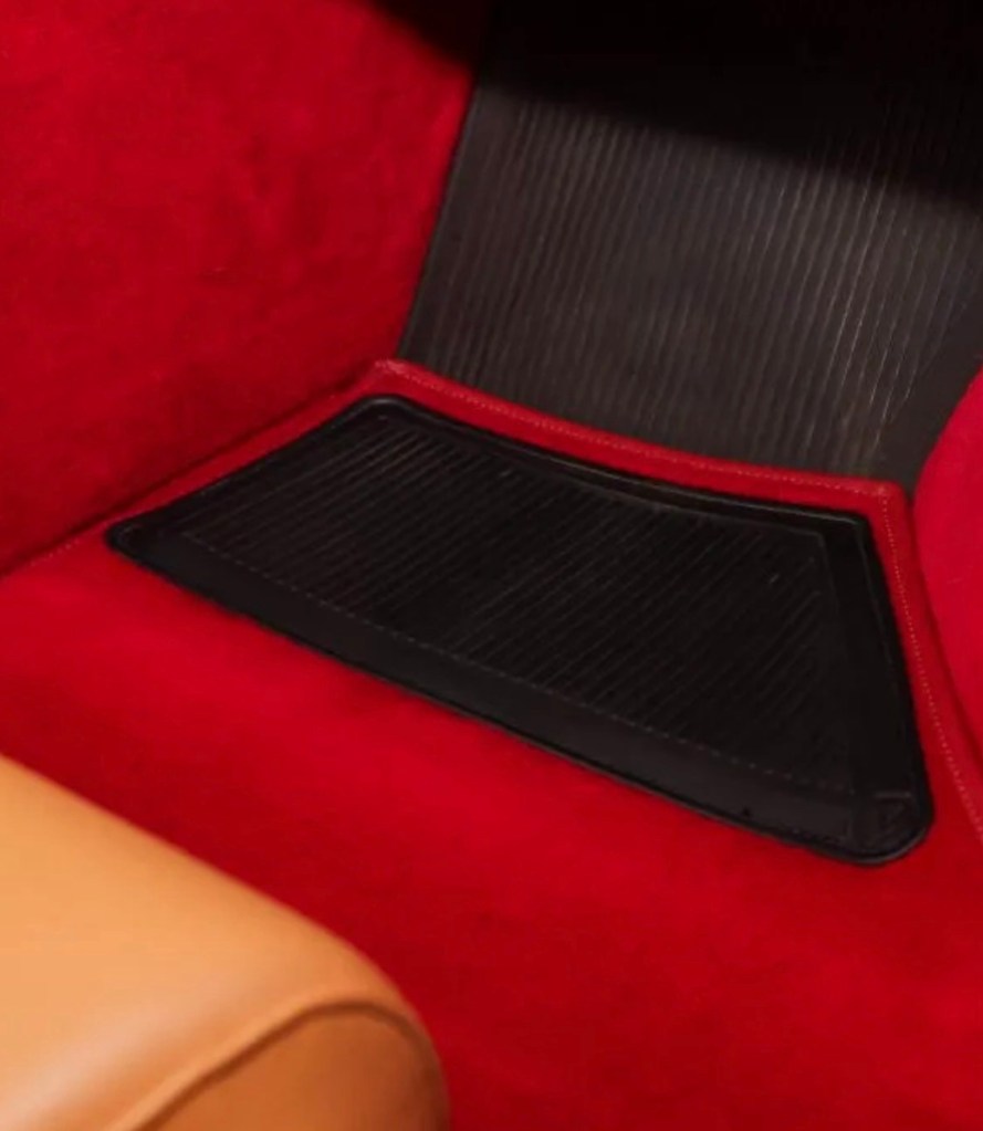 The red carpet is unusual and not to my taste, but after staring at it for quite a while I believe both it and the floor mats to be original. Which is remarkable because rarely have the original floor mats survived in such pristine condition. The only shame here being the aftermarket speakers cut through the doors.